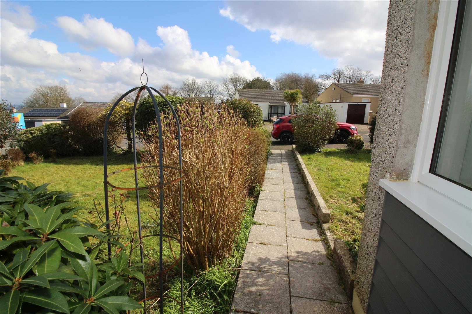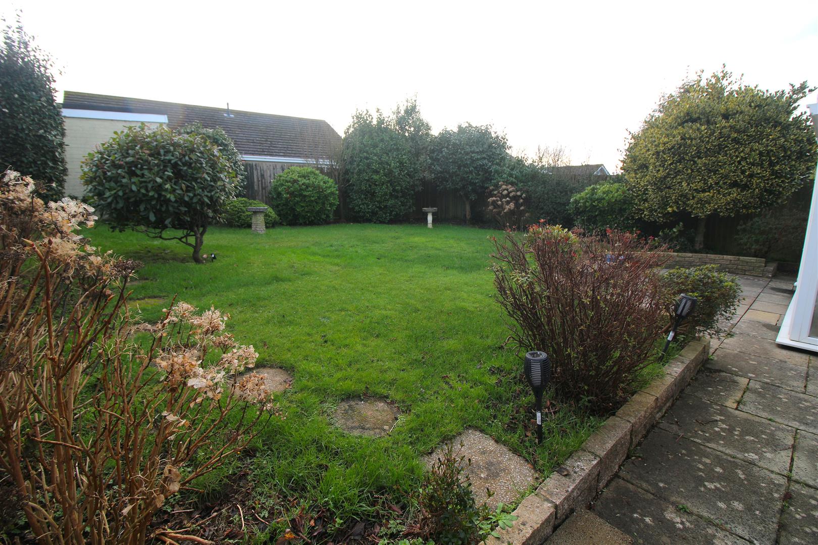 Level front garden which is mainly laid to lawn with various mature plants and shrubs to the boarders, pathway leading to the front door, the front garden extends to a level side garden.