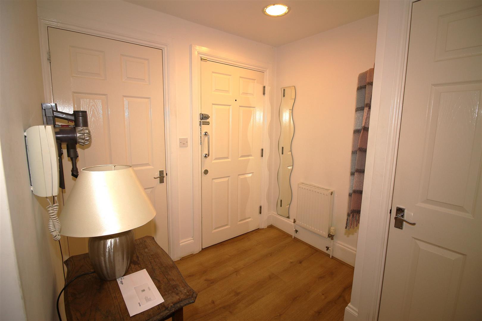 Doorways leading into the living accommodation, radiator, wall mounted video entry phone system, two storage cupboards, downlighting, smoke alarm, wooden flooring.